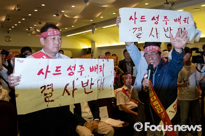 (서울=포커스뉴스) 국방부가 사드 배치 지역을 경북 성주로 확정지은 13일 오후 서울 용산구 국방컨벤션을 찾은 김항곤 군수와 군민들이 반대의사 표시한 혈서를 들고 항의하고 있다.