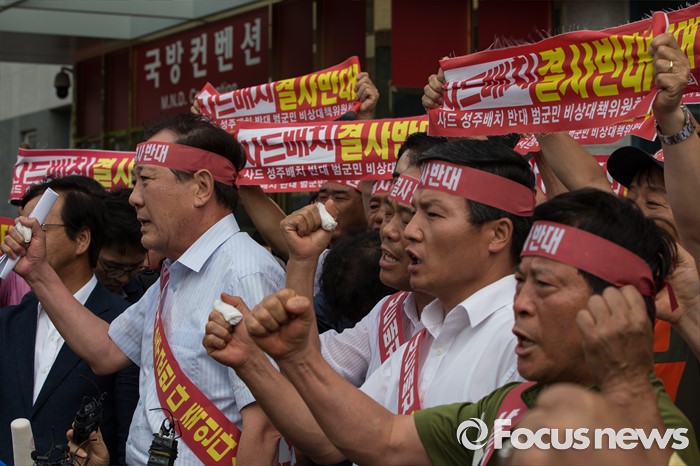 (서울=포커스뉴스) 국방부가 사드 배치 지역을 경북 성주로 확정지은 13일 오후 서울 용산구 국방컨벤션을 찾은 김항곤 군수와 군민들이 사드배치 반대 기자회견을 하고 있다.