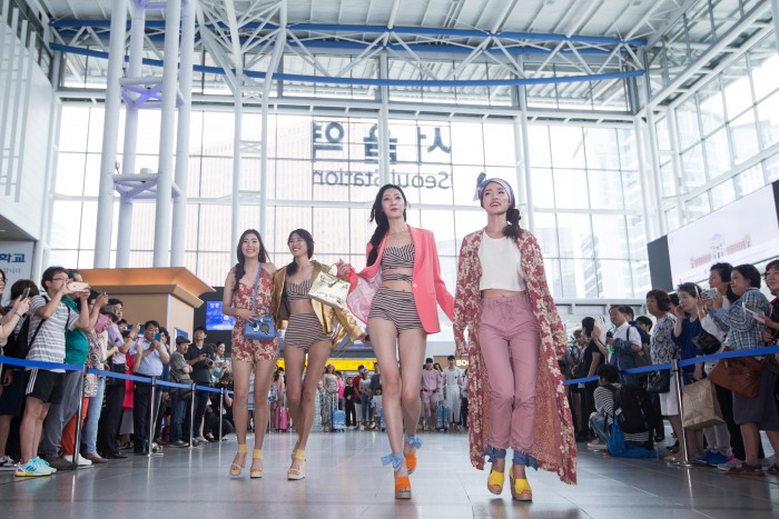 이날 패션쇼에는 서울역 직원과 KTX승무원 등이 전문모델 40여명과 함께 참여, 역사와 열차 승강장에서 각양각색의 바캉스 의상을 입고 퍼레이드를 벌였다.13일 서울역 대합실에서 열린 '바캉스 패션쇼'에서 모델들이 여름 의상을 선보이고 있다.<사진제공=코레일>
