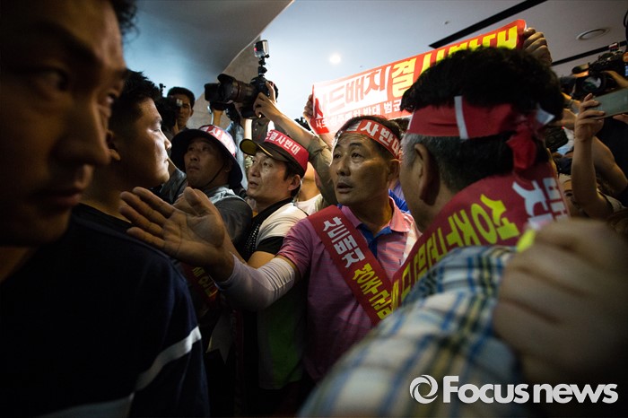 (서울=포커스뉴스) 국방부가 사드 배치 지역을 경북 성주로 확정 지은 13일 오후 서울 용산구 국방컨벤션에서 성주군민들이 군수와 국방부 관계자 면담자리에 진입을 시도하고 있다.