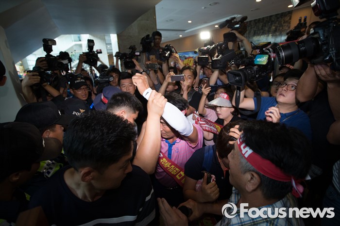 (서울=포커스뉴스) 국방부가 사드 배치 지역을 경북 성주로 확정 지은 13일 오후 서울 용산구 국방컨벤션에서 성주군민들이 군수와 국방부 관계자 면담자리에 진입을 시도하고 있다.