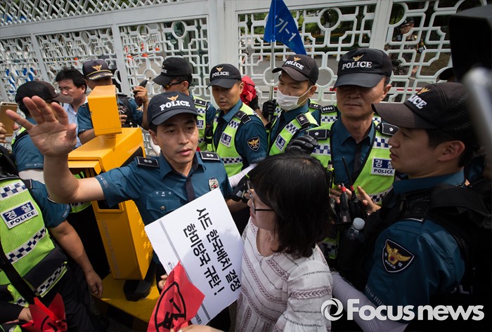 | △ 국방부 앞에서 시위자 저지하는 경찰 |