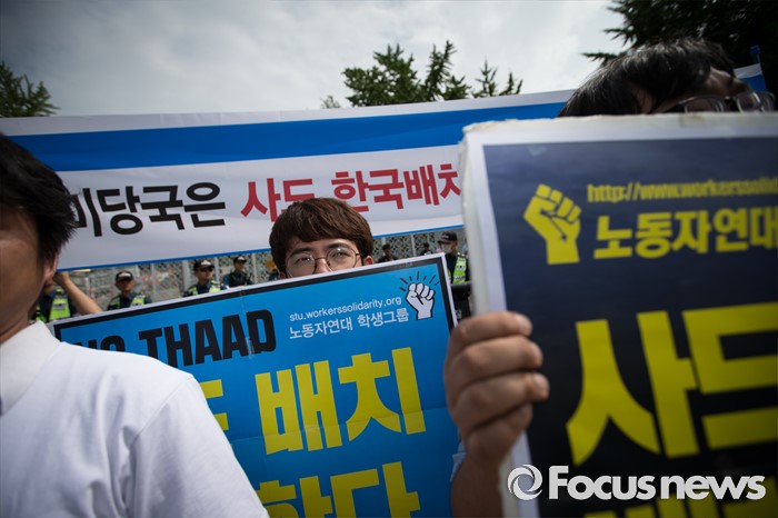 (서울=포커스뉴스) 13일 오후 평통사(평화와 통일을 여는 사람들) 관계자 및 시민들이 서울 용산구 국방부 앞에서 성주 사드 배치 반대 시위를 하고 있다. 이날 국방부는 주한미군 고고도 미사일 방어 체계 사드(THAAD) 배치 지역을 성주로 결정, 발표 했다.