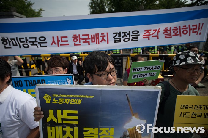 (서울=포커스뉴스) 13일 오후 평통사(평화와 통일을 여는 사람들) 관계자 및 시민들이 서울 용산구 국방부 앞에서 성주 사드 배치 반대 시위를 하고 있다. 이날 국방부는 주한미군 고고도 미사일 방어 체계 사드(THAAD) 배치 지역을 성주로 결정, 발표 했다.