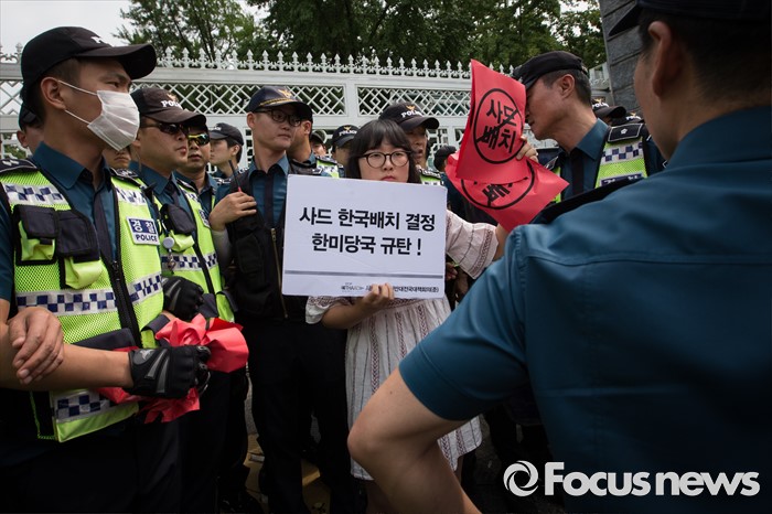 (서울=포커스뉴스) 13일 오후 평통사(평화와 통일을 여는 사람들) 관계자 및 시민들이 서울 용산구 국방부 앞에서 성주 사드 배치 반대 시위를 하고 있다. 이날 국방부는 주한미군 고고도 미사일 방어 체계 사드(THAAD) 배치 지역을 성주로 결정, 발표 했다.