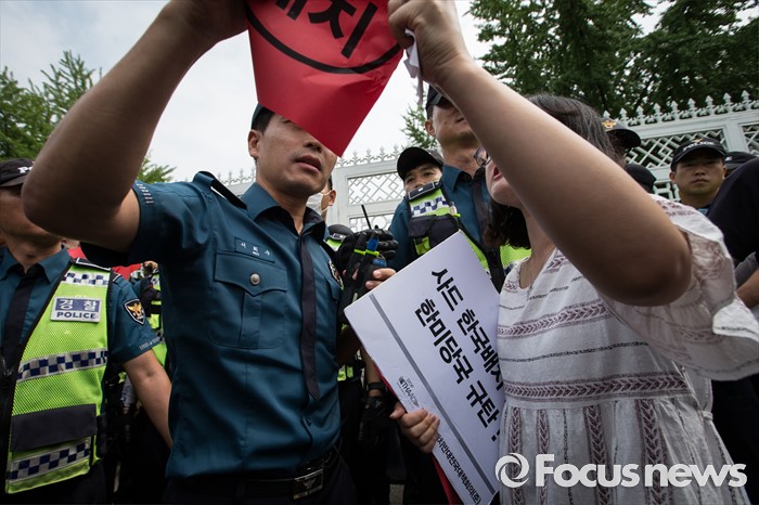 (서울=포커스뉴스) 13일 오후 평통사(평화와 통일을 여는 사람들) 관계자 및 시민들이 서울 용산구 국방부 앞에서 성주 사드 배치 반대 시위를 하고 있다. 이날 국방부는 주한미군 고고도 미사일 방어 체계 사드(THAAD) 배치 지역을 성주로 결정, 발표 했다.