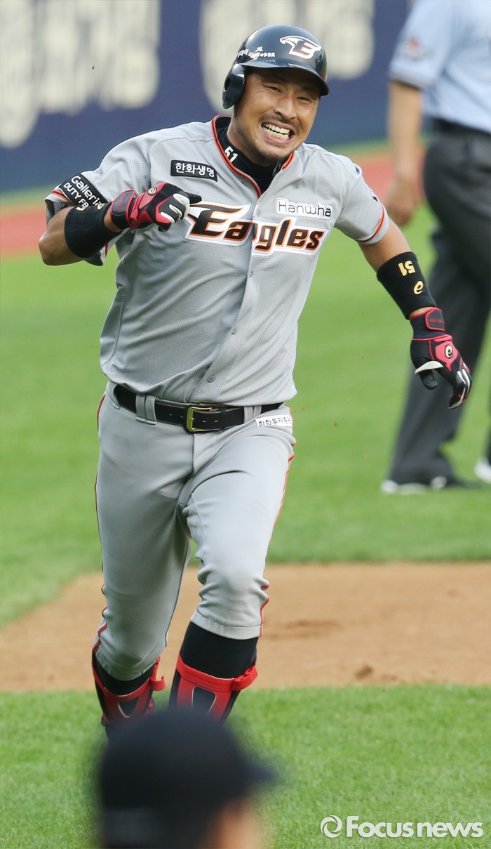 (서울=포커스뉴스) 13일 서울 잠실구장에서 열린 2016 프로야구 한화-LG 경기 1회초 2사 2,3루에서 한화 김경언이 중견수앞 3루타를 치고 3루를 지나 홈으로 온 힘을 다 해 달리고 있다.