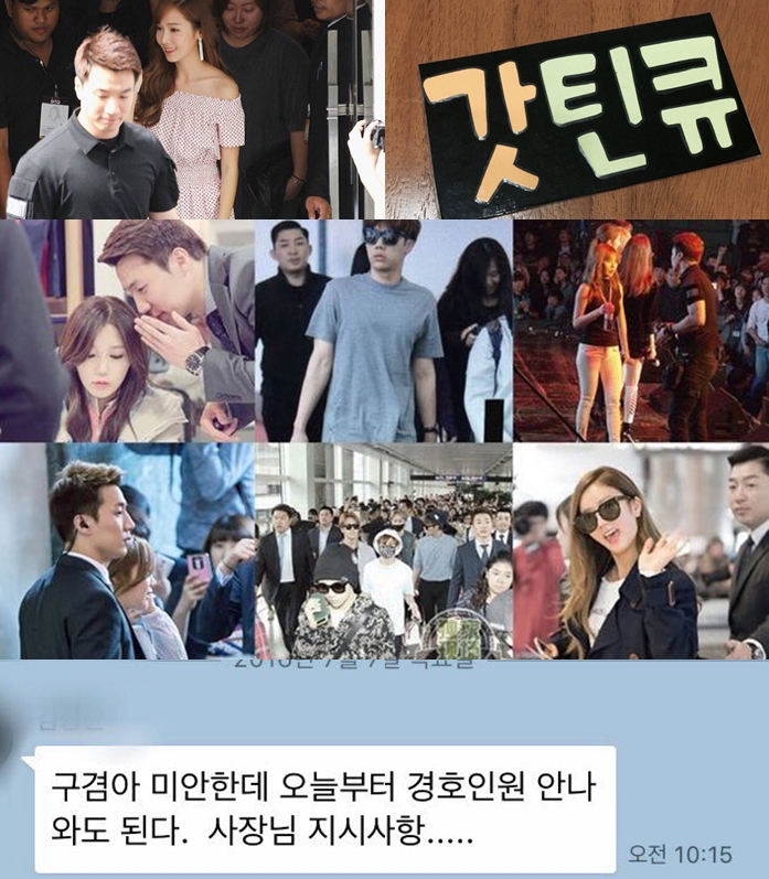13일 자정께 경호업체 캡틴큐 트위터에는 지난 7일 캡틴큐 대표가 큐브 관계자로부터 받은 짧은 메시지가 담긴 사진 하나가 올라왔다. 사진 속 글에는 ‘구겸아(캡틴큐 대표) 미안한데 오늘부터 경호인원 안 나와도 된다. 사장님(박충민 대표) 지시사항’이라는 해고 통지 내용이 담겨 있다.