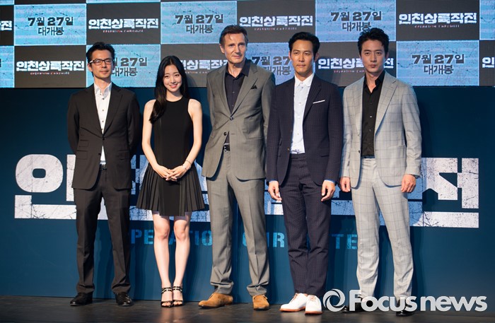 (서울=포커스뉴스) 13일 오후 서울 영등포구 타임스퀘어에서 열린 영화 '인천상륙작전' 레드카펫 행사에 참석한 출연진들이 포즈를 취하고 있다. 왼쪽부터 이재한 감독, 배우 진세연, 리암 리슨, 이정재, 정준호.