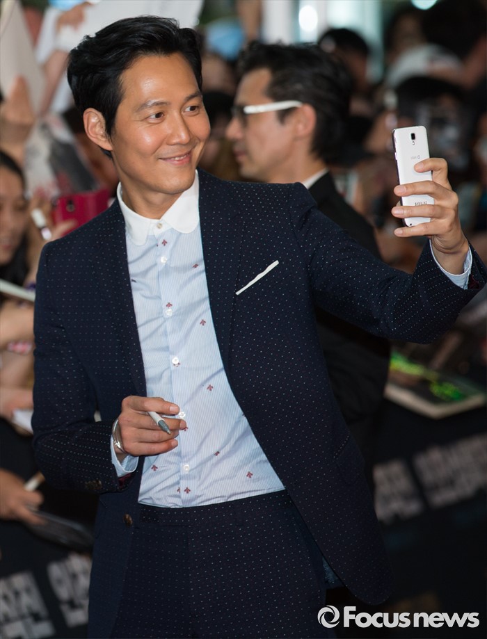 (서울=포커스뉴스) 13일 오후 서울 영등포구 타임스퀘어에서 열린 영화 '인천상륙작전' 레드카펫 행사에 참석한 배우 이정재가 팬들과 사진 찍고 있다.