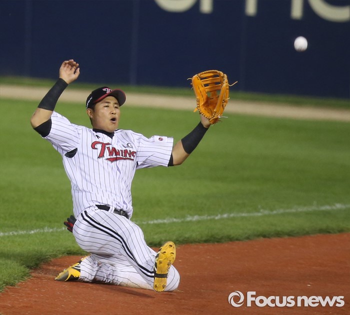 | △ 파울플라이 잡으려 몸을 날리는 LG 채은성 |