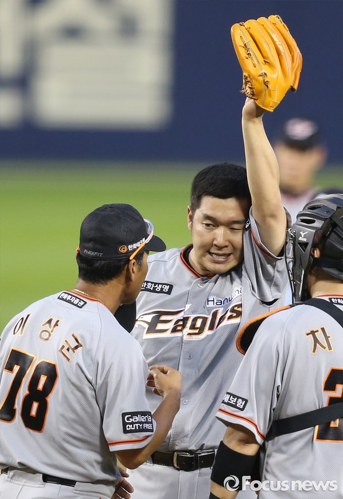 | △ 얼굴의 땀을 닦는 한화 송은범 |