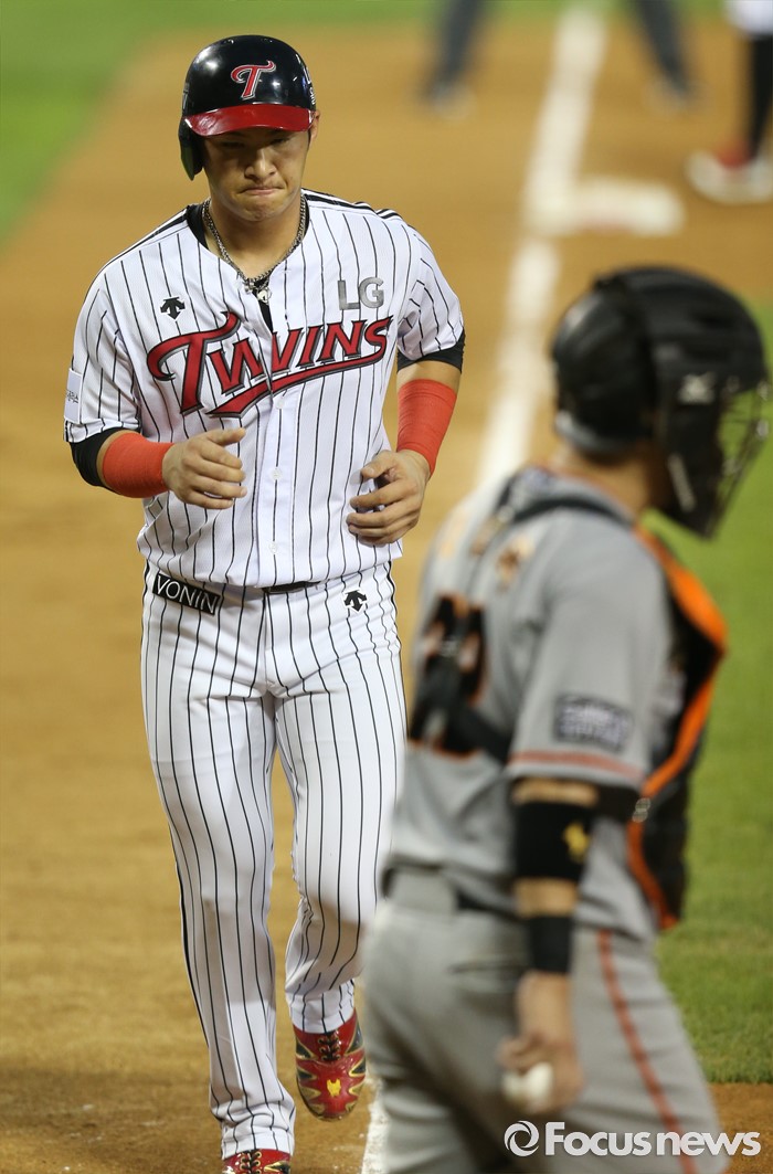 (서울=포커스뉴스) 13일 서울 잠실구장에서 열린 2016 프로야구 한화-LG 경기 4회말 2사 만루에서 LG 이천웅의 볼넷으로 3루주자 오지환이 홈인하고 있다.
