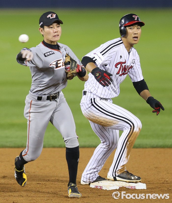 (서울=포커스뉴스) 13일 서울 잠실구장에서 열린 2016 프로야구 한화-LG 경기 4회말 2사 만루에서 한화 유격수 강경학이 LG 정성훈의 유격수앞 땅볼을 잡아 1루로 송구하고 있다. 오른쪽 LG 주자는 이천웅.