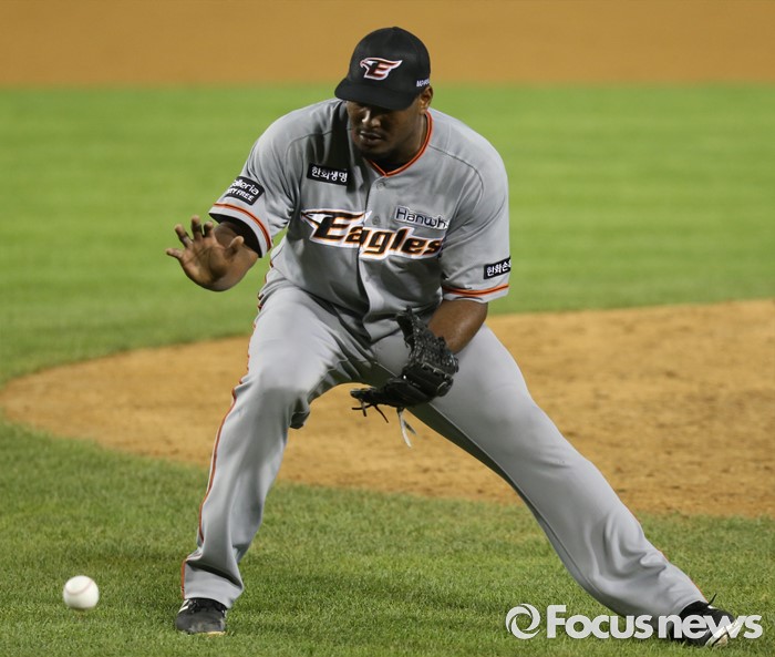 (서울=포커스뉴스) 13일 서울 잠실구장에서 열린 2016 프로야구 한화-LG 경기 7회말 무사 1루에서 등판한 한화 투수 카스티요가 LG 이천웅의 번트 타구를 잡고 있다.