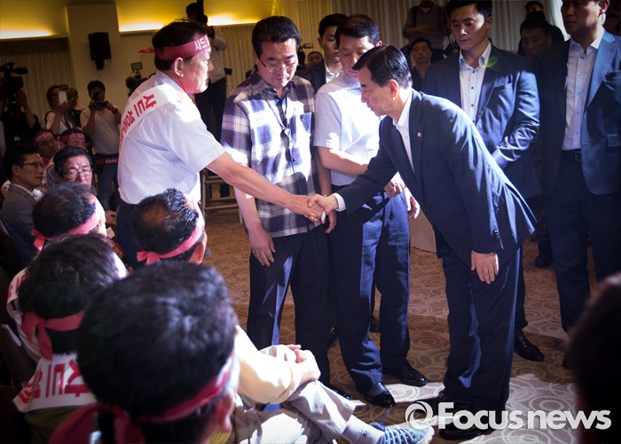 (서울=포커스뉴스) 한민구(오른쪽) 국방부 장관이 13일 오후 서울 용산구 국방컨벤션센터에서 사드 배치에 항의 방문 중인 성주 군수 등 사회단체장 및 군민들과 대화를 마친 후 김항곤 군수와 악수를 하고 있다. 국방부는 이날 경북 성주군을 고고도 미사일 방어(사드·THAAD)체계 배치 지역이라고 공식 발표했다.