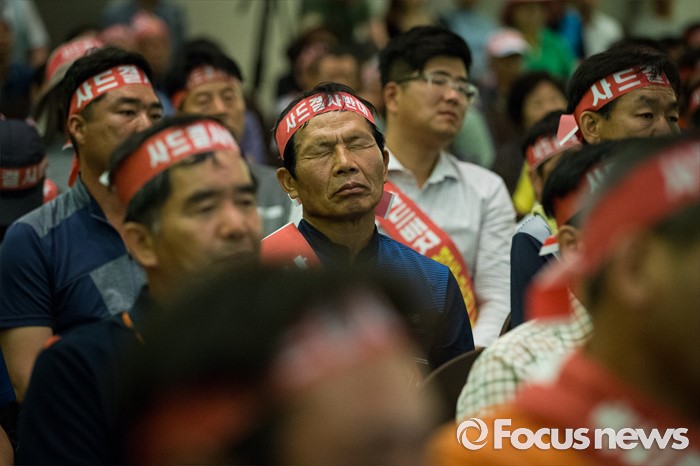(서울=포커스뉴스) 13일 오후 서울 용산구 국방컨벤션센터에서 사드 배치에 항의 방문 중인 성주 군민들이 한민구 국방부 장관의 말을 듣고 있다. 국방부는 이날 경북 성주군을 고고도 미사일 방어(사드·THAAD)체계 배치 지역이라고 공식 발표했다.
