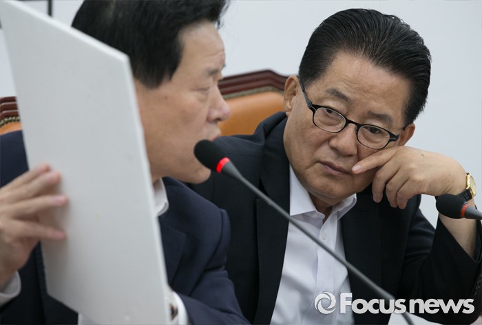 문 대표가 박 위원장에게 "우리 당에서는 어떻게 문제제기하고 조치할 수 있나"고 묻자 박 위원장은 "참습니다"고 답해 사회적으로 물의를 빚었다.13일 오전 서울 여의도 국회에서 열린 국민의당 비상대책위원회의에 참석한 박지원(오른쪽) 비대위원장이 주승용 비대위원의 2015년도 추경 철도 및 고속도로 사업 집행 실적 관련 발언을 듣고 있다. 2016.07.13 박동욱 기자