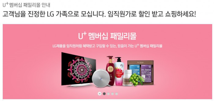 박상훈 LG유플러스 PS모바일마케팅부문장은 “U+패밀리샵을 통해 뛰어난 품질의 LG 제품들을 부담 없는 가격에 선보이게 됐고 멤버십 혜택을 풍성하게 채워가는 만큼 고객 만족도를 높이기 위해 지속적으로 노력할 계획”이라고 말했다.LG유플러스는 멤버십으로 할인받아 물건을 구매할 수 있는 U+패밀리샵을 열었다.<사진=LG유플러스 홈페이지>