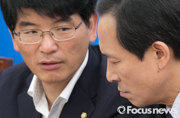 (서울=포커스뉴스) 14일 오전 서울 여의도 국회에서 열린 더불어민주당 정책조정회의에 참석한 우상호(오른쪽) 원내대표와 박완주 원내수석부대표가 대화하고 있다.