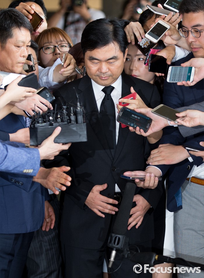 (서울=포커스뉴스) '주식 대박' 논란에 휩싸인 진경준 검사장이 14일 오전 서울 서초구 서울중앙지방검찰청으로 출석하고 있다.