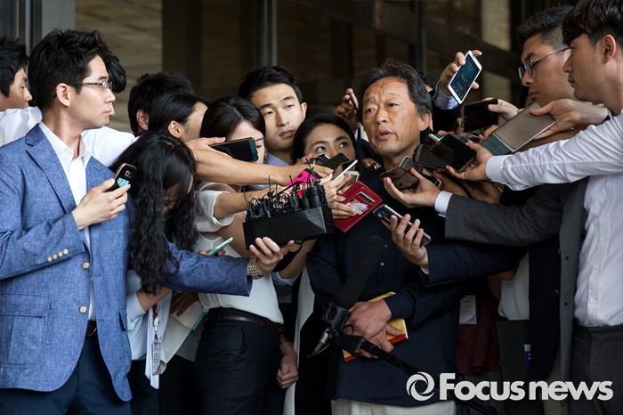 (서울=포커스뉴스) 박현정 전 서울시립교향악단 대표와 법적 분쟁을 벌이고 있는 정명훈(가운데) 전 서울시향 예술감독이 검찰 조사를 위해 14일 오전 서울중앙지방검찰청으로 출석하기 전 취재진의 질문을 받고 있다.