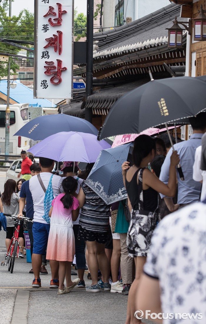 (서울=포커스뉴스) 초복을 사흘 앞둔 14일 오후 서울 종로구에 위치한 한 삼계탕 전문식당을 찾은 시민들이 줄을 서고 있다.
