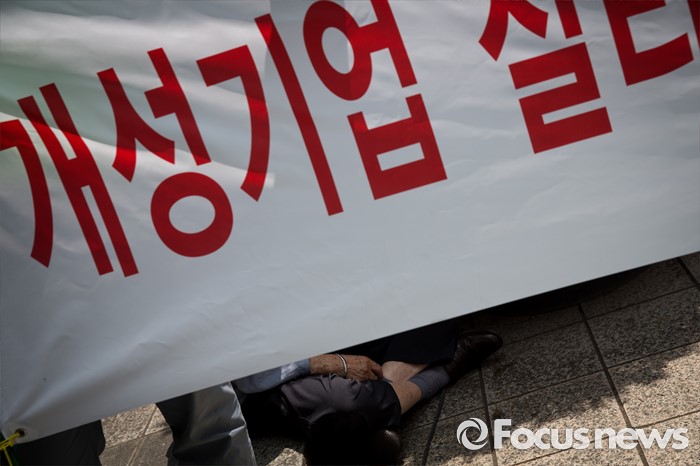 (서울=포커스뉴스) 14일 오후 서울 영등포구 국회의사당역 인근에서 개성공단 비상대책위원회원들이 정부의 폐쇄 조치에 따른 재산권 보호를 촉구하며 집회를 하고 있다.