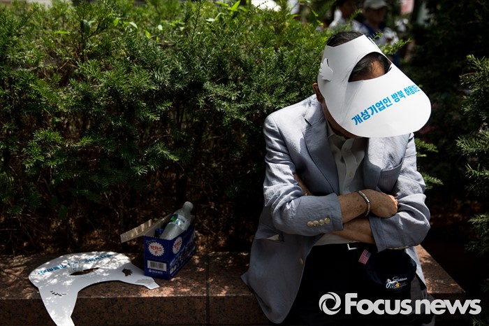 (서울=포커스뉴스) 14일 오후 서울 영등포구 국회의사당역 인근에서 개성공단 비상대책위원회원들이 정부의 폐쇄 조치에 따른 재산권 보호를 촉구하며 집회를 하고 있다.