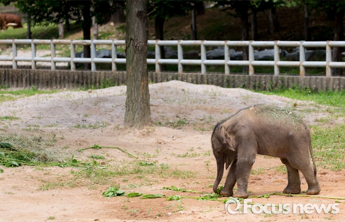 (과천=포커스뉴스) 14일 오후 경기도 과천 서울대공원에서 지난달 24일에 태어난 새끼 아시아 코끼리(암컷)가 야외 방사장을 뛰놀고 있다. 이 아기코끼리는 '멸종위기에 처한 야생 동식물의 국제 거래에 관한 협약(CITES)' 1급 보호종으로 지정된 아시아코끼리다.