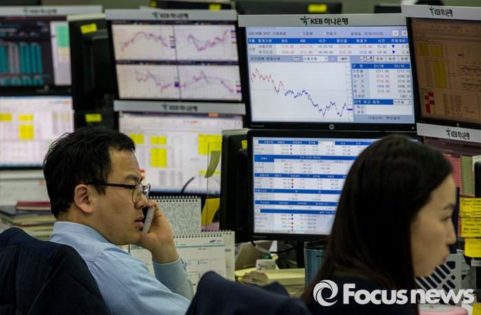 전문가들은 "국내 주식시장에서 외국인 자금 유입은 당분간 이어질 것"이라며 "달러 가치 상승 재료 부재로 역외 달러 매도가 소폭 우위를 보이는 점도 원달러 환율 하락 압력에 일조할 것"이라고 설명했다.(서울=포커스뉴스) 서울 중구 KEB하나은행 딜링룸에서 딜러들이 원달러 상황을 점검 하고 있다. 강진형 기자