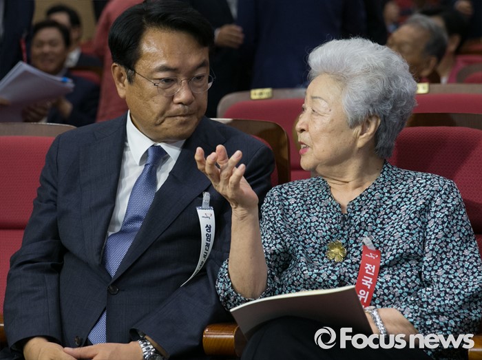 (서울=포커스뉴스) 14일 오후 서울 여의도 국회 의원회관에서 열린 새누리당 전국위원회에 참석한 정진석(왼쪽) 원내대표와 이연숙 상임고문이 대화하고 있다.