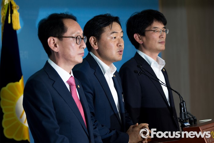 (서울=포커스뉴스) 김관영(가운데) 국민의당 원내수석부대표가 14일 오후 서울 여의도 국회에서 여야3당 원내수석부대표 합의사항을 발표하고 있다. 이날 여야3당은 사드(고고도미사일방어체계) 국내 배치 결정에 따른 논한과 관련해 다음주 긴급 현안 질의를 위한 국회 본회의를 개최하는데 합의 했다고 밝혔다.