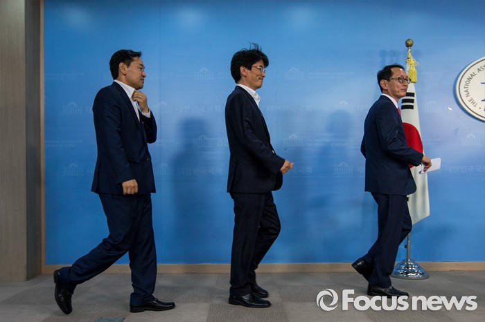 (서울=포커스뉴스) 여야3당 원내수석부대표가 14일 오후 서울 여의도 국회에서 여야3당 원내수석부대표 합의사항을 발표하기 위해 기자회견장으로 들어서고 있다. 왼쪽부터 김관영 국민의당 원내수석부대표, 박완주 더불어민주당 원내수석부대표, 김도읍 새누리당 원내수석부대표.