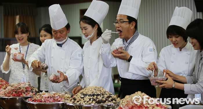 (대전=포커스뉴스) 초복을 사흘 앞둔 14일 오후 대전 유성구청에서 열린 팥빙수데이 행사에서 허태정 구청장과 직원들이 함께 팥빙수를 만들고 있다. 이번 팥빙수데이 행사에는 팥빙수 900인분을 만들어 구 산하 직원들에게 전달했다.