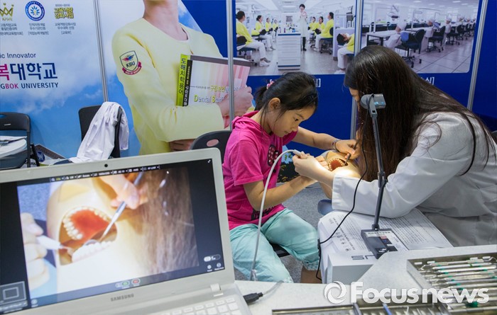(서울=포커스뉴스) 14일 오후 서울 강남구 코엑스에서 열린 전문대학 엑스포에 참가한 한 어린이가 모의 치과치료를 체험하고 있다.