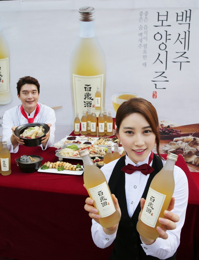 한편, 백세주는 문화체육관광부와 농림축산식품부가 공동으로 선정한 '우수문화상품'에 주류제품 중 유일하게 지정돼 우리나라 문화상품으로 인정받고 있다.'백세주' 모델이 삼계탕 등 보양식과 백세주를 들고 소개하고 있다.<사진제공=국순당>