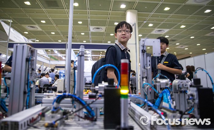 (서울=포커스뉴스) 14일 오후 서울 강남구 코엑스에서 열린 전문대학 엑스포에 참가한 학생들이 공장 자동화 설비 모형을 바라보고 있다.