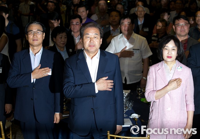 (서울=포커스뉴스) 14일 오후 서울 영등포구 그랜드컨벤션센터에서 열린 당대표 취임 2주년 행사에 참석한 김무성 새누리당 전 대표 등 참석자들이 국기에 대한 경례를 하고 있다.