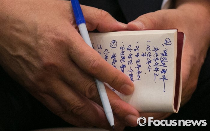 (서울=포커스뉴스) 14일 오후 서울 영등포구 그랜드컨벤션센터에서 열린 당대표 취임 2주년 행사에 참석한 김무성 새누리당 전 대표의 작성 메모가 보이고 있다.