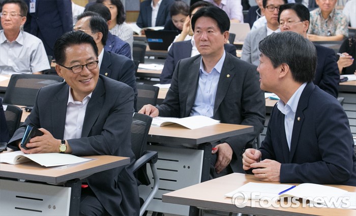 (서울=포커스뉴스) 14일 오후 서울 여의도 국회 의원회관에서 국민의당 주최로 열린 '국민의 동의없는 사드 배치 올바른 결정인가' 토론회에 참석한 박지원(왼쪽) 비대위원장과 안철수 전 대표가 대화하고 있다.