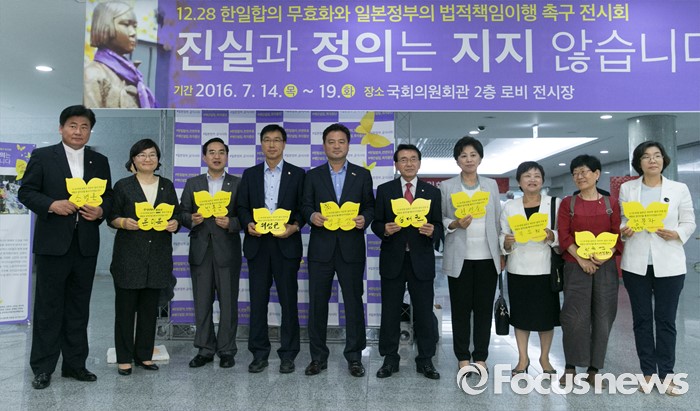 (서울=포커스뉴스) 더불어민주당 소속 심재권 외교통일위원장과 남인순 여성가족위원장 등 의원들이 14일 오후 서울 여의도 국회 의원회관에서 열린 12·28 한일합의 무효화와 일본정부의 법적책임이행 촉구를 위한 '진실과 정의는 지지 않습니다' 전시회에 참석해 본인들이 서명한 노란 나비 종이를 들고 포즈를 취하고 있다.