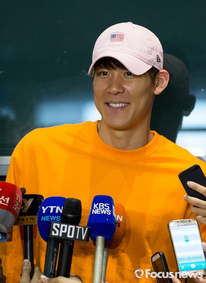 (인천공항=포커스뉴스) 리우 올림픽 출전이 확정된 '마린보이' 박태환이 호주 전지훈련을 마치고 14일 오후 인천국제공항을 통해 입국해 기자회견을 하고 있다.