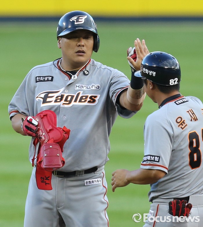 (서울=포커스뉴스) 14일 서울 잠실구장에서 열린 2016 프로야구 한화-LG 경기 1회초 1사 1,3루에서 한화 김태균이 주자를 모두 불러 들이는 우중간 2루타를 치고 윤재국 코치와 하이파이브하고 있다.
