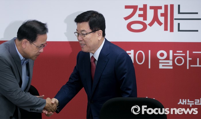 (서울=포커스뉴스) 15일 오전 서울 여의도 국회에서 열린 2016년도 추가경정예산 당정협의에 참석한 김광림(오른쪽) 새누리당 정책위의장과 이명수 민생특위 위원장이 인사하고 있다.