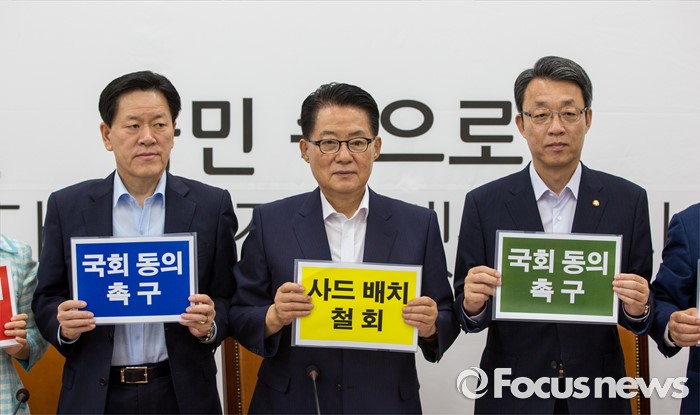 (서울=포커스뉴스) 박지원(가운데) 국민의당 비상대책위원장과 김성식(오른쪽) 정책위의장, 주승용 의원이 15일 오전 서울 여의도 국회에서 열린 비대위원-중진의원 연석회의에 참석해 '새드배치 철회, 국회동의 촉구'란 문구가 적힌 피켓을 들고 사진촬영을 하고 있다.
