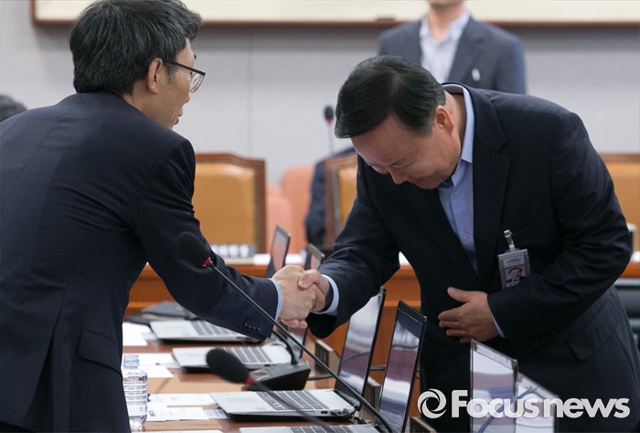 (서울=포커스뉴스) 15일 오전 서울 여의도 국회에서 예정된 운영위원회 전체회의에 참석한 김재원(오른쪽) 청와대 정무수석이 야당 의원들과 인사하고 있다. 이날 새누리당은 더불어민주당 소속 홍영표 국회 환경노동위원장이 야당 단독으로 예비비 지출안 등을 처리한 것과 관련해 홍 위원장의 사퇴를 요구하며 모든 상임위 보이콧을 선언했다.