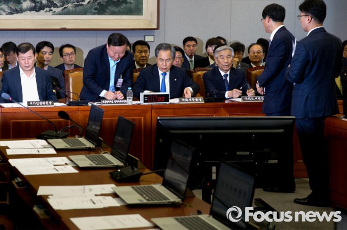 (서울=포커스뉴스) 15일 오전 서울 여의도 국회에서 예정된 운영위원회 전체회의에 참석한 김재원 청와대 정무수석과 우윤근 국회 사무총장 등이 관계자로부터 회의 취소 설명을 들은 뒤 퇴장하고 있다. 이날 새누리당은 더불어민주당 소속 홍영표 국회 환경노동위원장이 야당 단독으로 예비비 지출안 등을 처리한 것과 관련해 홍 위원장의 사퇴를 요구하며 모든 상임위 보이콧을 선언했다.