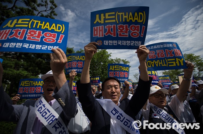 (서울=포커스뉴스) 15일 오전 서울 용산 국방부 앞에서 재향군인회 회원들 및 관계자들이 사드 배치 환영 기자회견을 하고 있다.