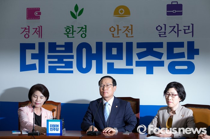 (서울=포커스뉴스) 15일 오전 서울 여의도 국회에서 홍영표 국회 환경노동위원장과 야당 환노위원들이 결산 표결 관련 입장을 전하는 기자간담회를 하고 있다. 이날 새누리당은 더불어민주당 소속 홍 위원장이 야당 단독으로 예비비 지출안 등을 처리한 것과 관련해 위원장 사퇴를 요구하며 모든 상임위 보이콧을 선언했다.